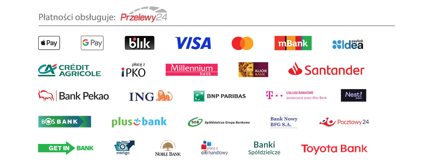 Rozliczenia transakcji kartą płatniczą i e-przelewem przeprowadzane są za pośrednictwem Przelewy24.