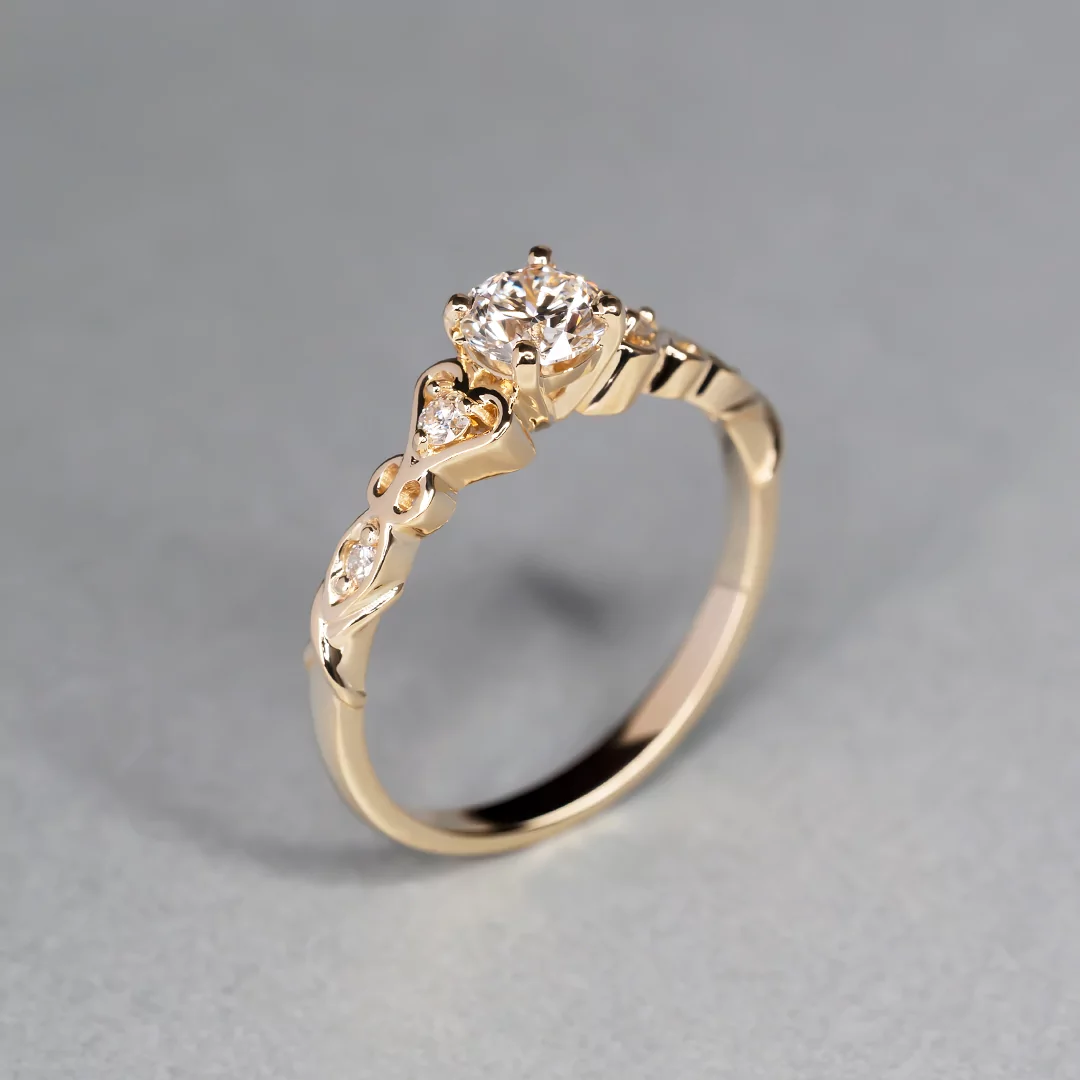 Pierścionek z brylantem laboratoryjnym o masie 0,50 ct i 4 naturalnymi brylantami o łącznej masie 0,10 ct, wykonany z 14-karatowego żółtego złota.