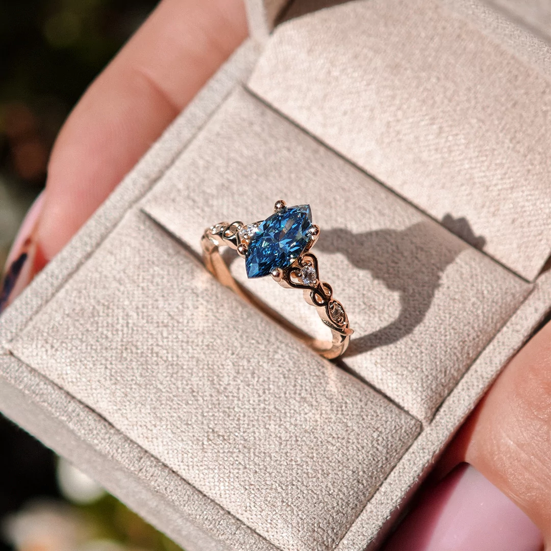Pierścionek z niebieskim diamentem laboratoryjnym o masie ~1 ct i 4 naturalnymi brylantami o łącznej masie 0,10 ct, wykonany z 14-karatowego różowego złota.