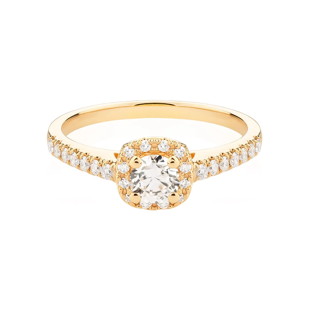 Pierścionek z diamentem laboratoryjnym o masie 0,25 ct i 26 diamentami o łącznej masie 0,20 ct, wykonany z 14-karatowego żółtego złota.