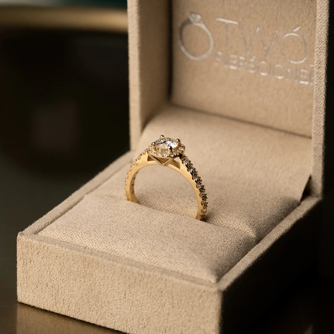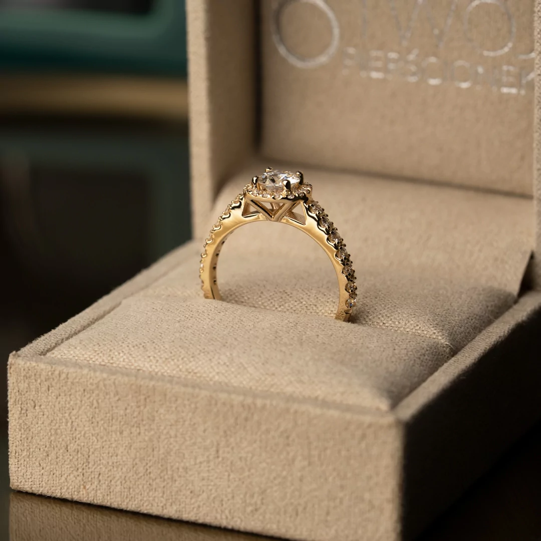 Pierścionek z moissanitem o masie ~0,45 ct i 30 diamentami o łącznej masie 0,29 ct, wykonany z 14-karatowego żółtego złota.