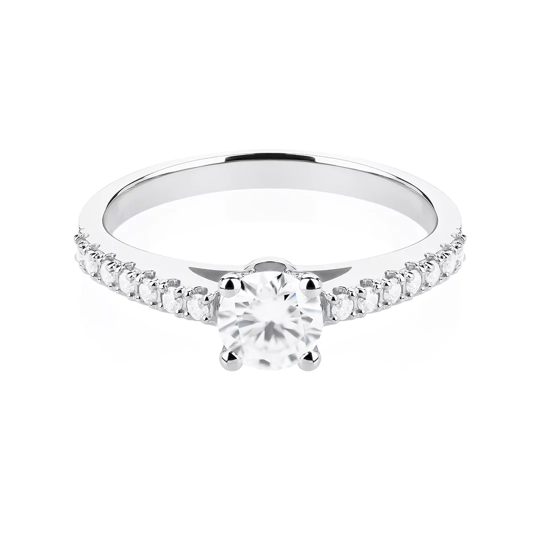Pierścionek z moissanitem o masie ~0,45 ct i 14 diamentami o łącznej masie 0,14 ct, wykonany z 14-karatowego białego złota.