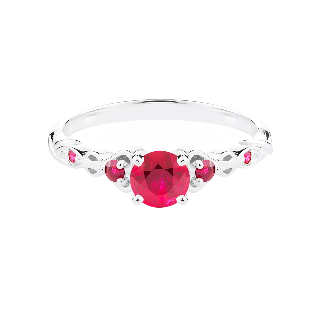 Złoty pierścionek zaręczynowy z rubinem o masie ~0,60 ct i 4 rubinami o łącznej masie 0,11 ct. Kruszec: złoto białe próba 585 (14K). Okazja: prezent, zaręczyny. Każdy pierścionek możemy wykonać z żółtego, białego i różowego złota. Dostępny centralny kamień szlachetny do wyboru: akwamaryn, ametyst, biały szafir, cytryn, czarny diament, diament naturalny, diament laboratoryjny, niebieski diament laboratoryjny, fioletowy szafir, granat, moissanit, morganit, niebieski szafir, niebieski topaz, rubin, różowy szafir, różowy topaz, szmaragd, tanzanit, topaz London Blue. Ozdobne opakowanie i korekta rozmiaru gratis.