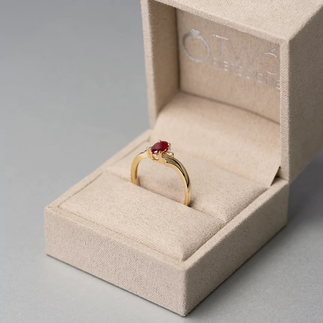 Pierścionek z rubinem o masie ~0,50 ct i 2 diamentami o łącznej masie 0,04 ct, wykonany z 14-karatowego żółtego złota.