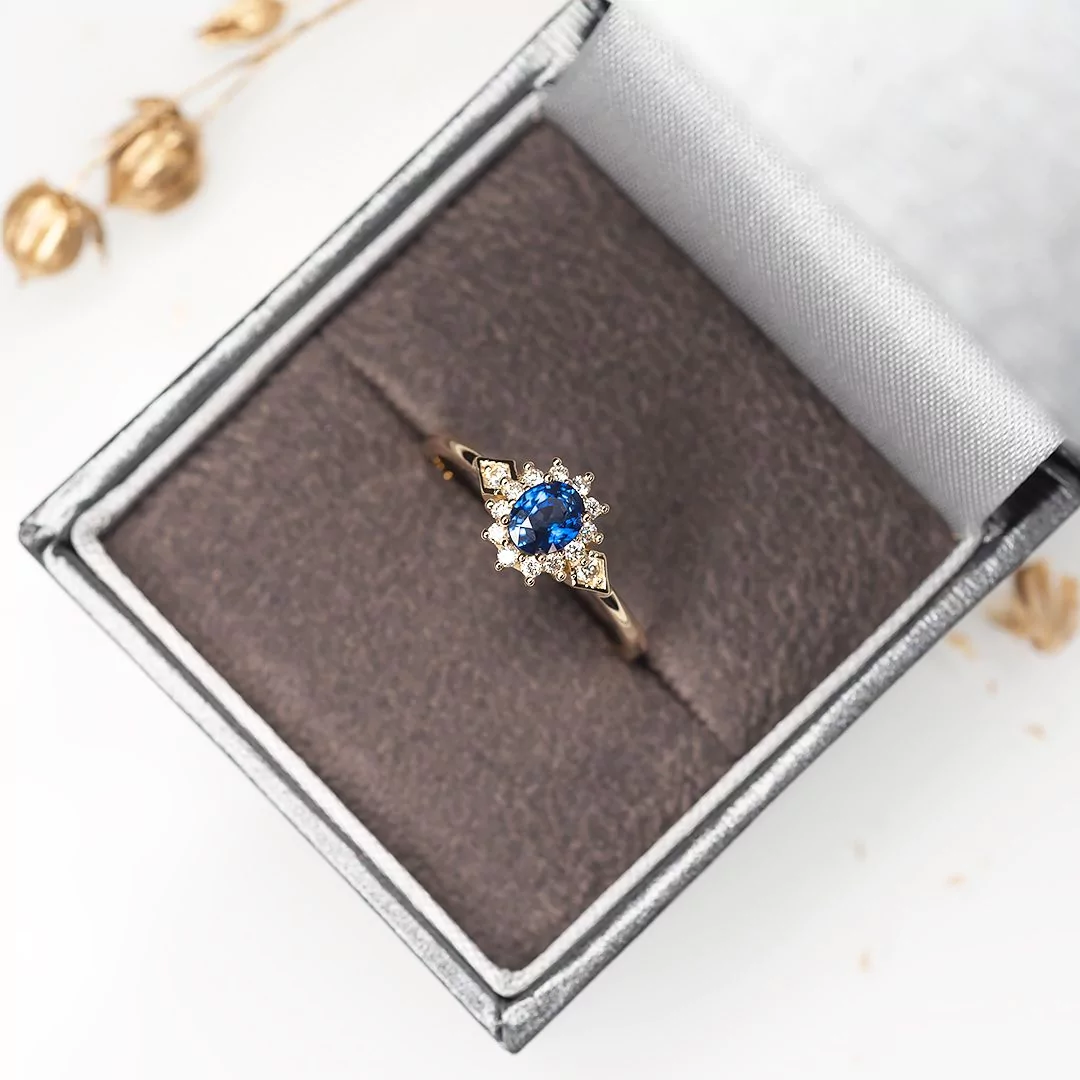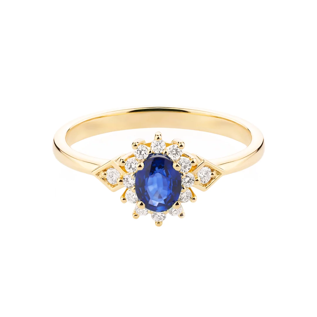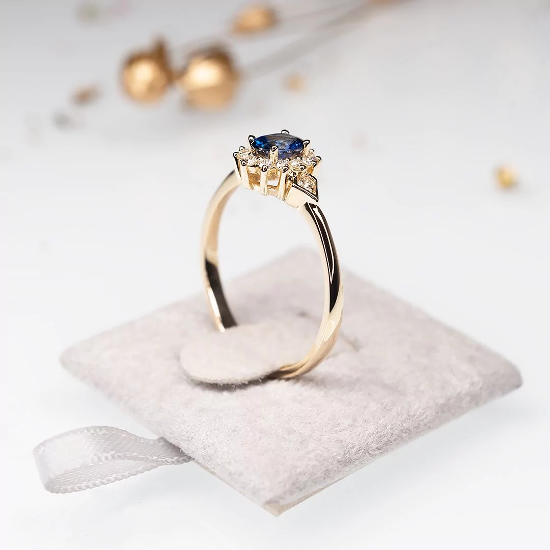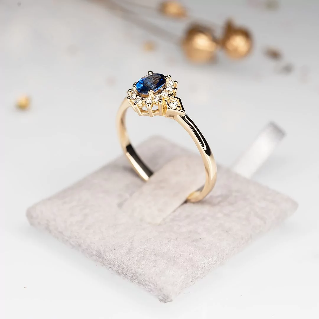 Pierścionek z niebieskim szafirem o masie ~0,40 ct i 14 diamentami o łącznej masie 0,15 ct, wykonany z 14-karatowego żółtego złota.
