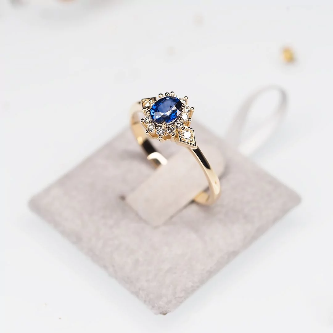Złoty pierścionek z niebieskim szafirem i diamentami TP0031ZNSR