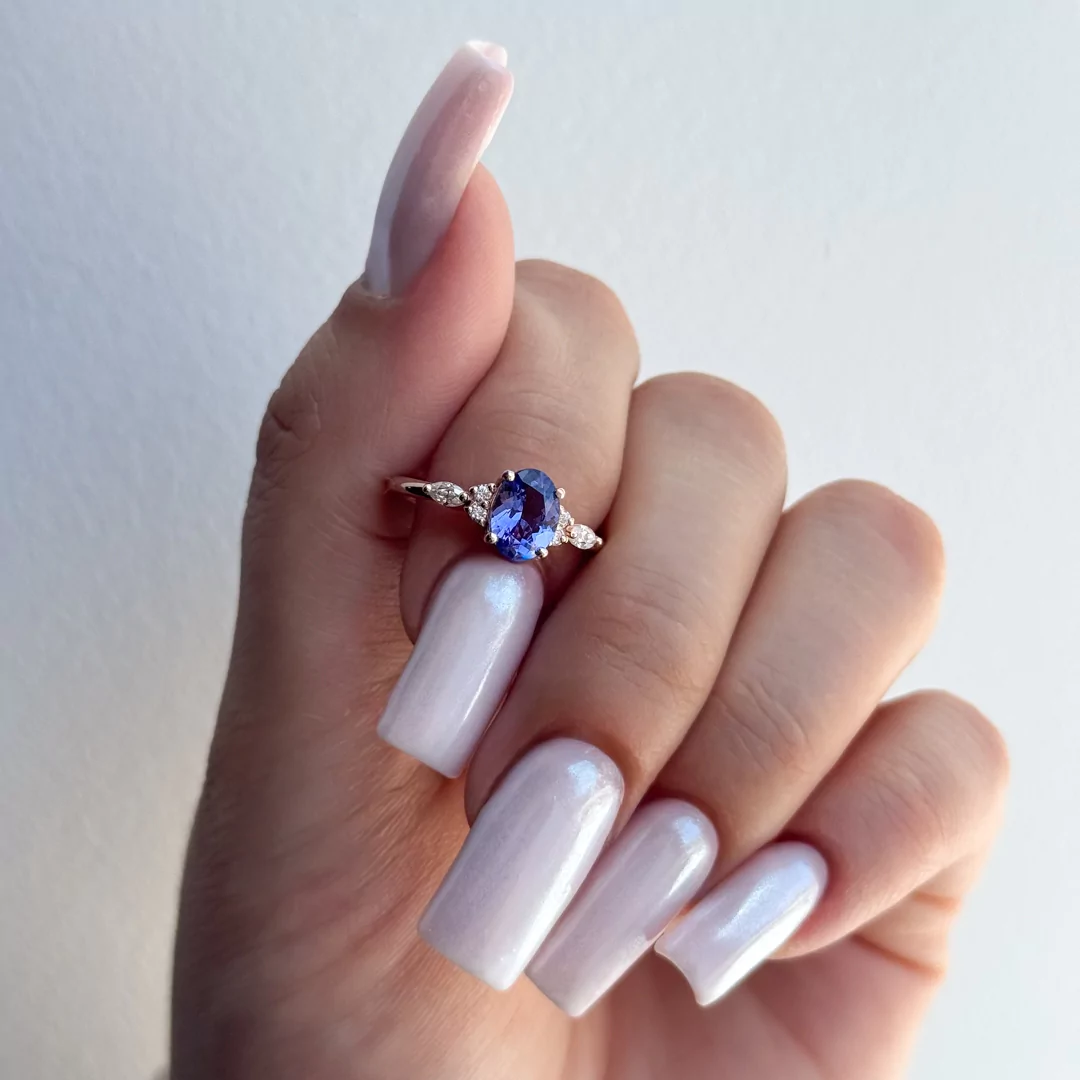 Pierścionek z tanzanitem o masie ~1,2 ct i 6 moissanitami o łącznej masie 0,18 ct, wykonany z 14-karatowego żółtego złota.