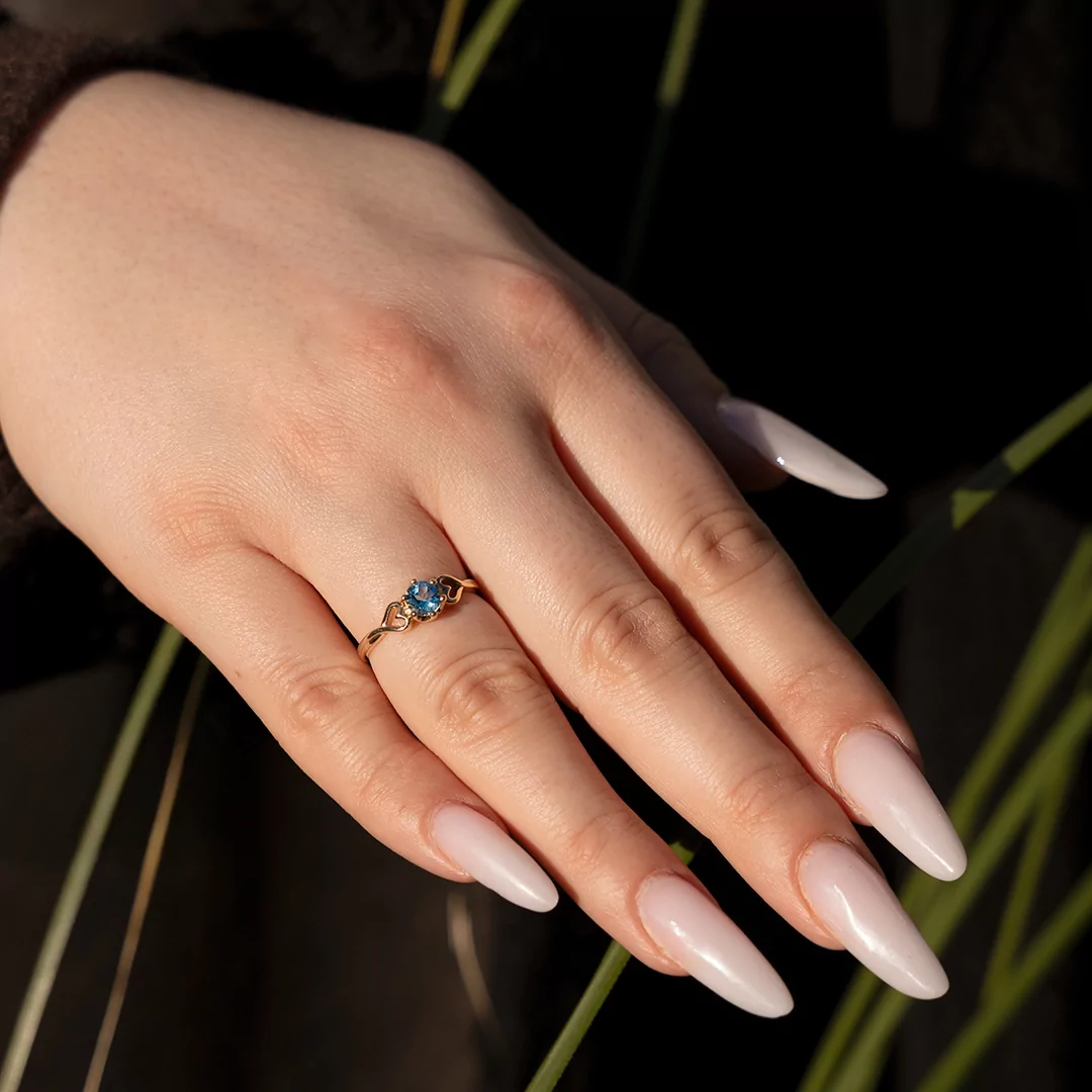 Pierścionek z niebieskim topazem o masie ~0,50 ct, wykonany z 14-karatowego żółtego złota.