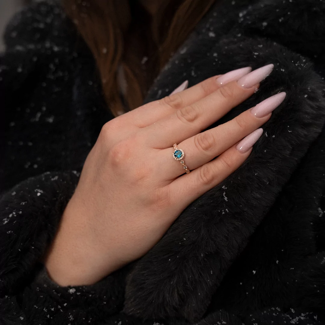 Pierścionek z topazem London Blue o masie ~0,50 ct i 22 diamentami o łącznej masie 0,17 ct, wykonany z 14-karatowego różowego złota.