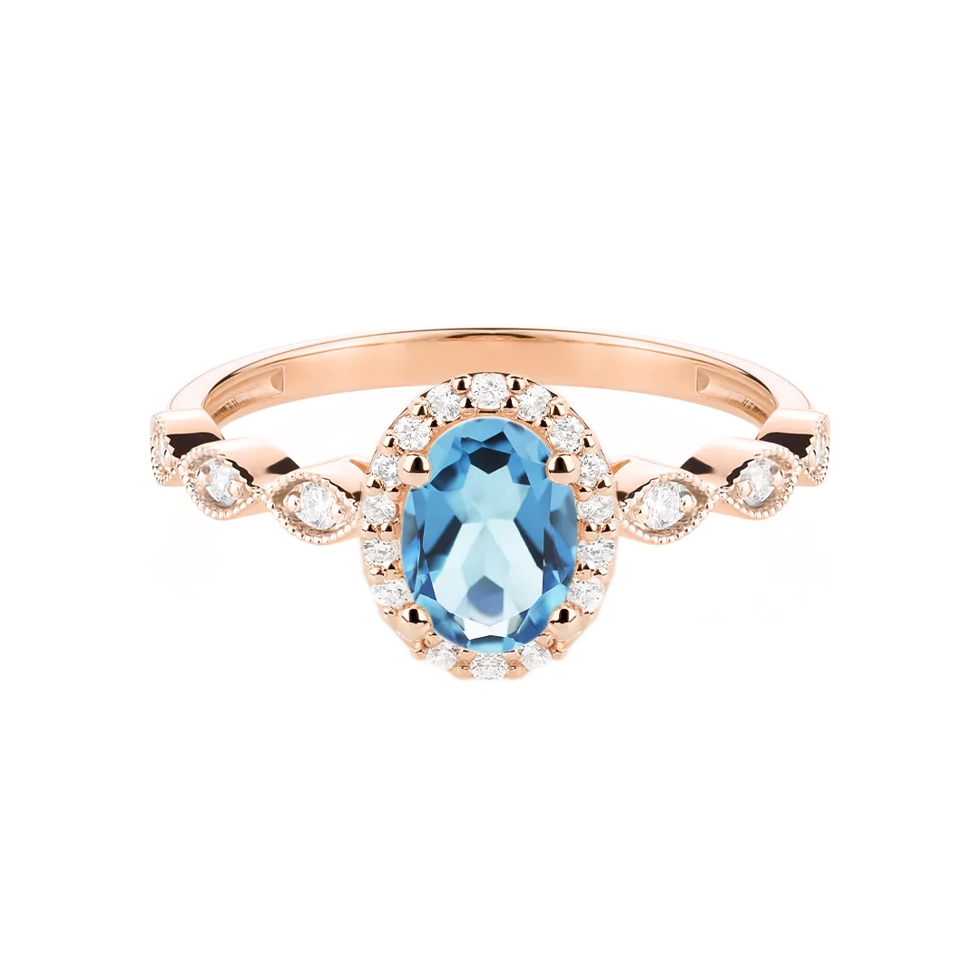 Pierścionek z niebieskim topazem o masie ~0,90 ct i 24 diamentami o łącznej masie 0,19 ct, wykonany z 14-karatowego różowego złota.