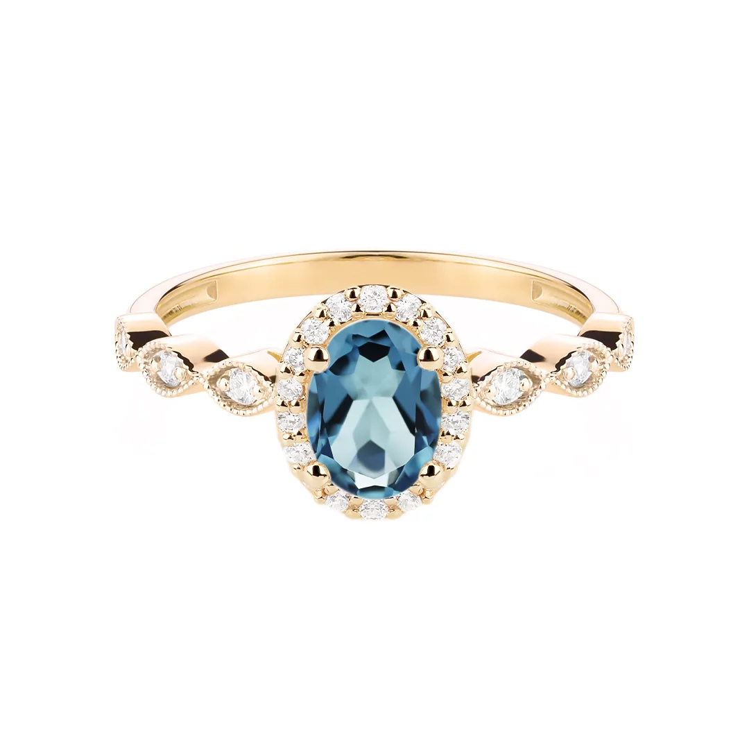 Pierścionek z topazem London Blue o masie ~0,90 ct i 24 diamentami o łącznej masie 0,19 ct, wykonany z 14-karatowego żółtego złota.